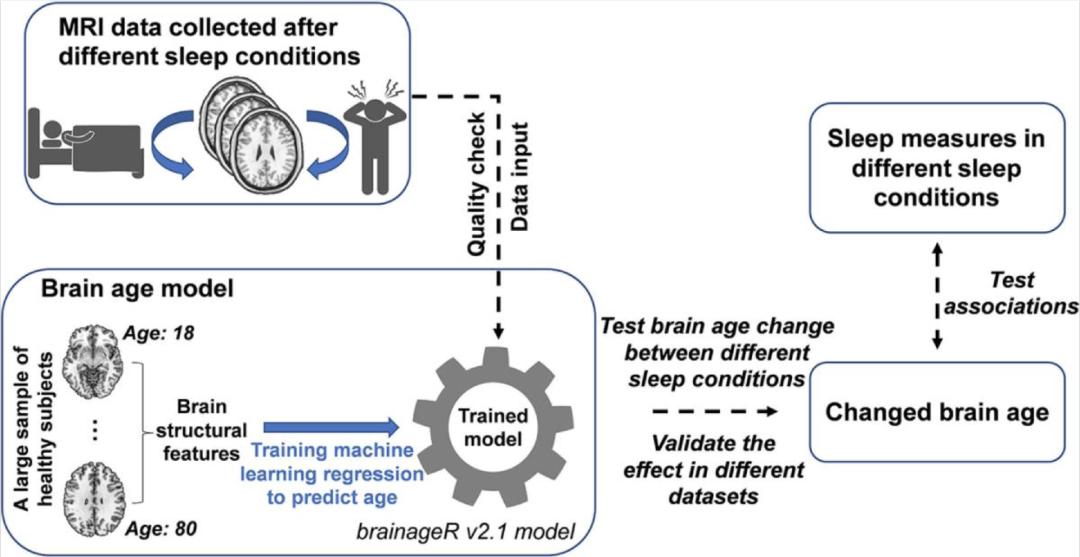 为了探明熬夜/通宵对大脑的影响,研究者采用机器学习模型和大脑特定特征来预测大脑的年龄,以此来评估大脑被影响的程度,从而明确睡眠时间和衰老之间的关联。