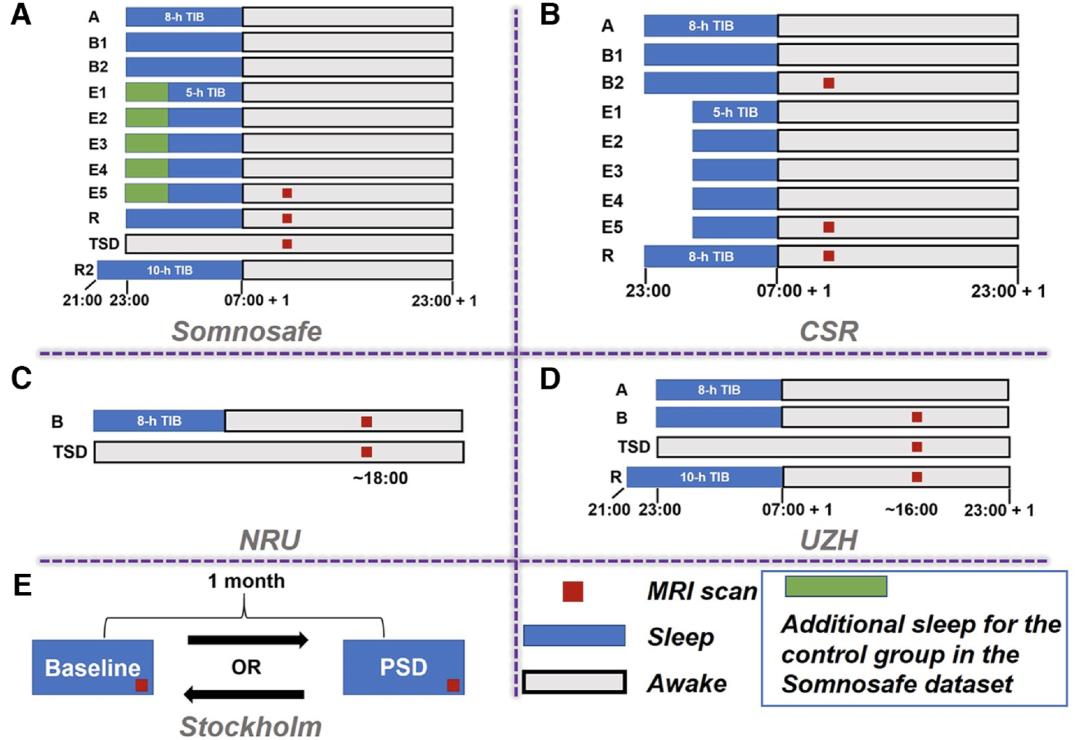 实验流程图基于此,研究者从五个不同睡眠条件的数据集中收集到134名健康志愿者的磁共振成像(MRI)数据,包括3个“完全睡眠剥夺”(>24小时不睡)的数据集,以及急性部分睡眠剥夺(一晚睡3小时)和慢性部分睡眠剥夺(连续5晚睡5小时)。