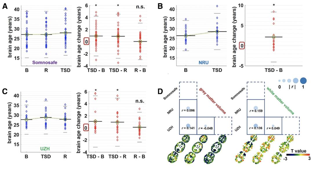 为了进一步确认完全睡眠剥夺对大脑的影响,研究者在另两个独立的数据集中进行了验证。与Somnosafe的结果一致,NRU数据集显示,完全睡眠剥夺导致大脑年龄增加了2.13岁,UZH数据集增加了1.07岁。