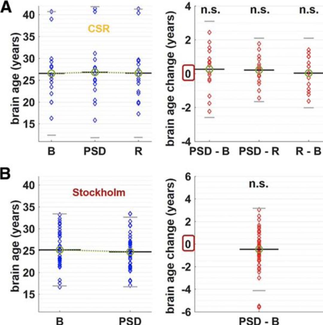 事实上,大脑年龄的衰老还伴随着卡罗林斯卡嗜睡量表(KSS)评分的增加,即从极度警觉(=1)发展为极度嗜睡(=9);同时,睡眠期间的正常化唤醒时间也会随之增加。