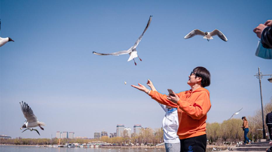 海宝公园展翅飞翔的海鸥与投喂的路人银川的春天是明媚的也是多风的,当人们伸出手指不会感到寒冷时,天空就成了风筝的家。还记得儿时父亲带着我去放风筝,他的手中拉着线,一收一放,风筝就飞得更高,我还要在我视线可及的范围内看是不是我们的风筝飞得最高。