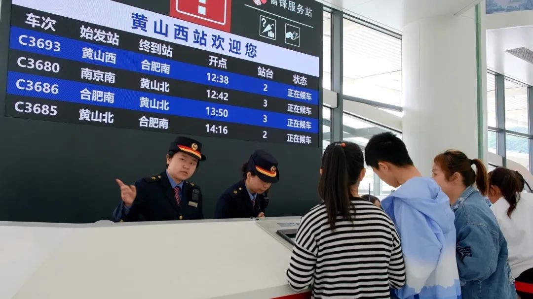 黄山西站12306服务台工作人员解答旅客咨询(汪林 摄)从目前的售票数据看,长三角多地往返北京、广州、福州、厦门、长沙等直通方向旅客列车车票依旧紧张,长三角区域内往返上海、杭州、南京、合肥、苏州、宁波、金华、扬州、黄山、芜湖、徐州等地动车组列车车票还有少量剩余;沪宁、沪杭、宁杭、杭黄、宁安、连镇等多条管内高铁线路客座率均达到九成以上。