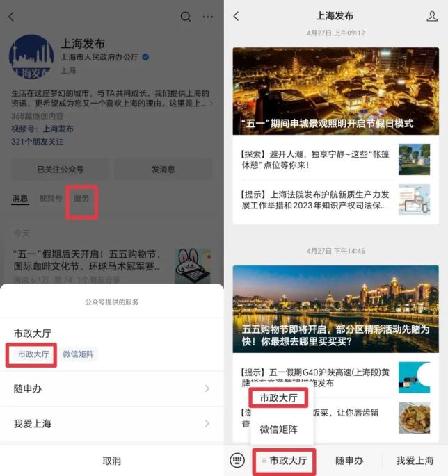 第一步:关注小布微信【上海发布】,选择【市政大厅】