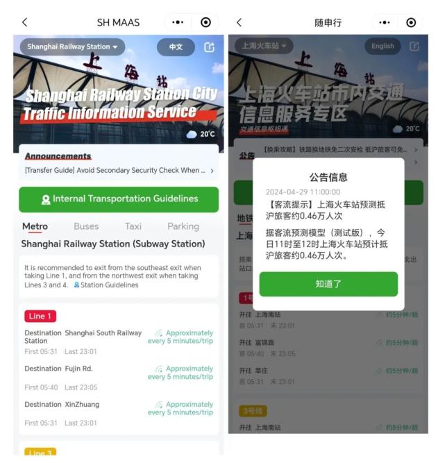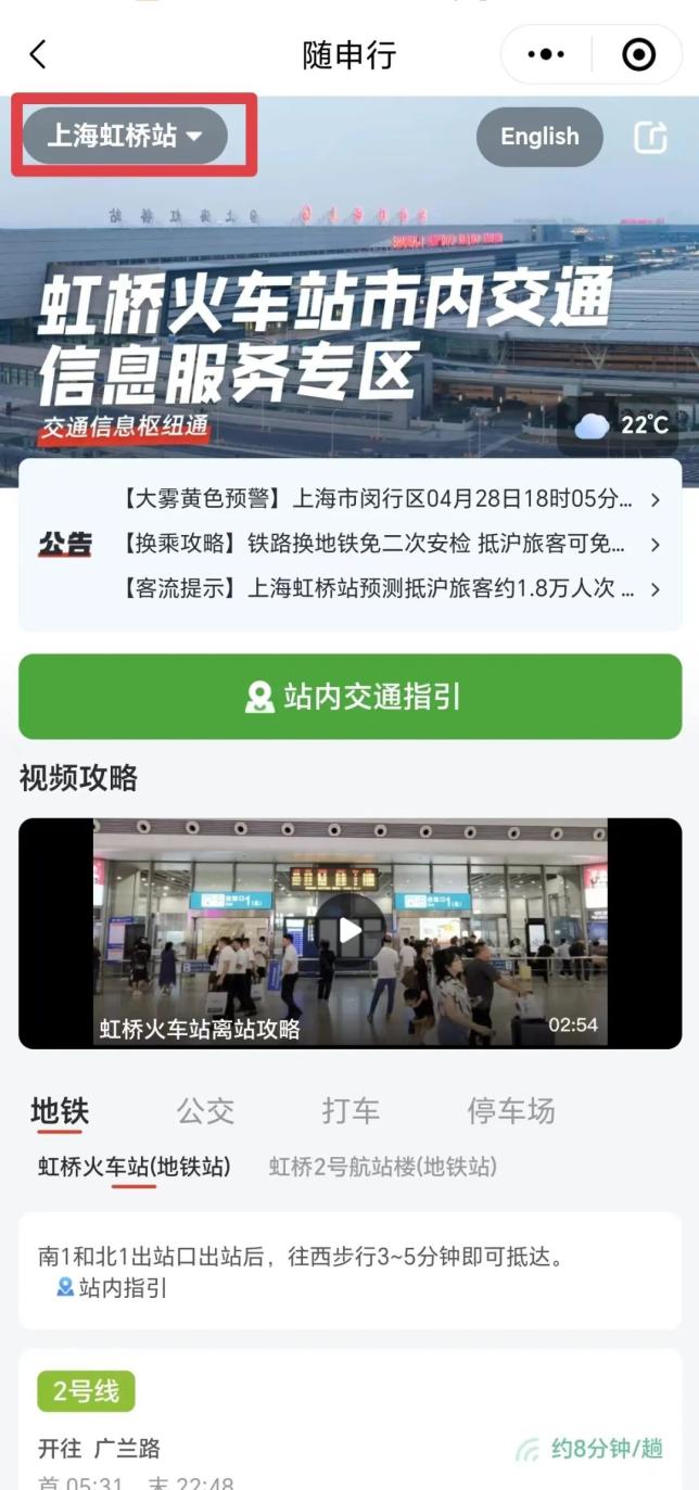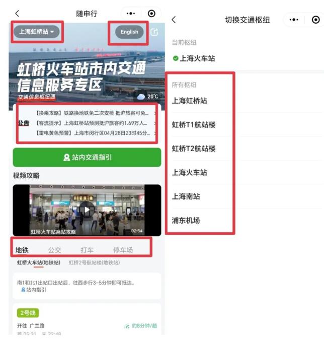第三步:在界面上可以看到左上角的选站按钮,点开选站按钮即可看到上海的各大站点;右上角有中英文转换;信息服务专区可以看到公告、站内交通指引及公共交通方式。公告内容包括换乘攻略、客流提示、天气预警信息,站内指引即站内地图,旅客可根据地图到达各公共交通站点,公共交通方式包括地铁、公交、打车等。