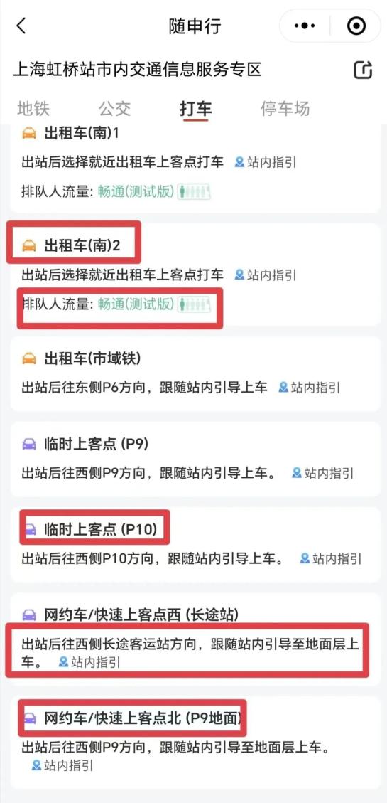 打车篇如果选择打车出行,则可以看到可选乘车站点(包括出租车、网约车等)、站点到达方式、站点排队情况等信息。