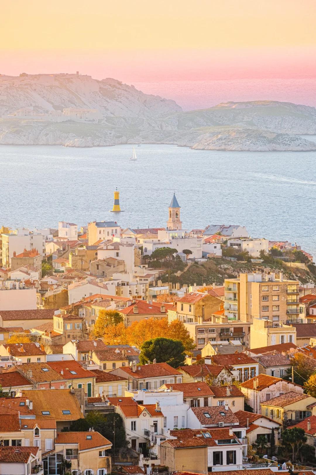 在马赛的教堂最高处,可以俯瞰马赛全城和地中海风光,以及飞翔的海鸥、矗立的灯塔和漂浮的小船,更适合看一场日落。