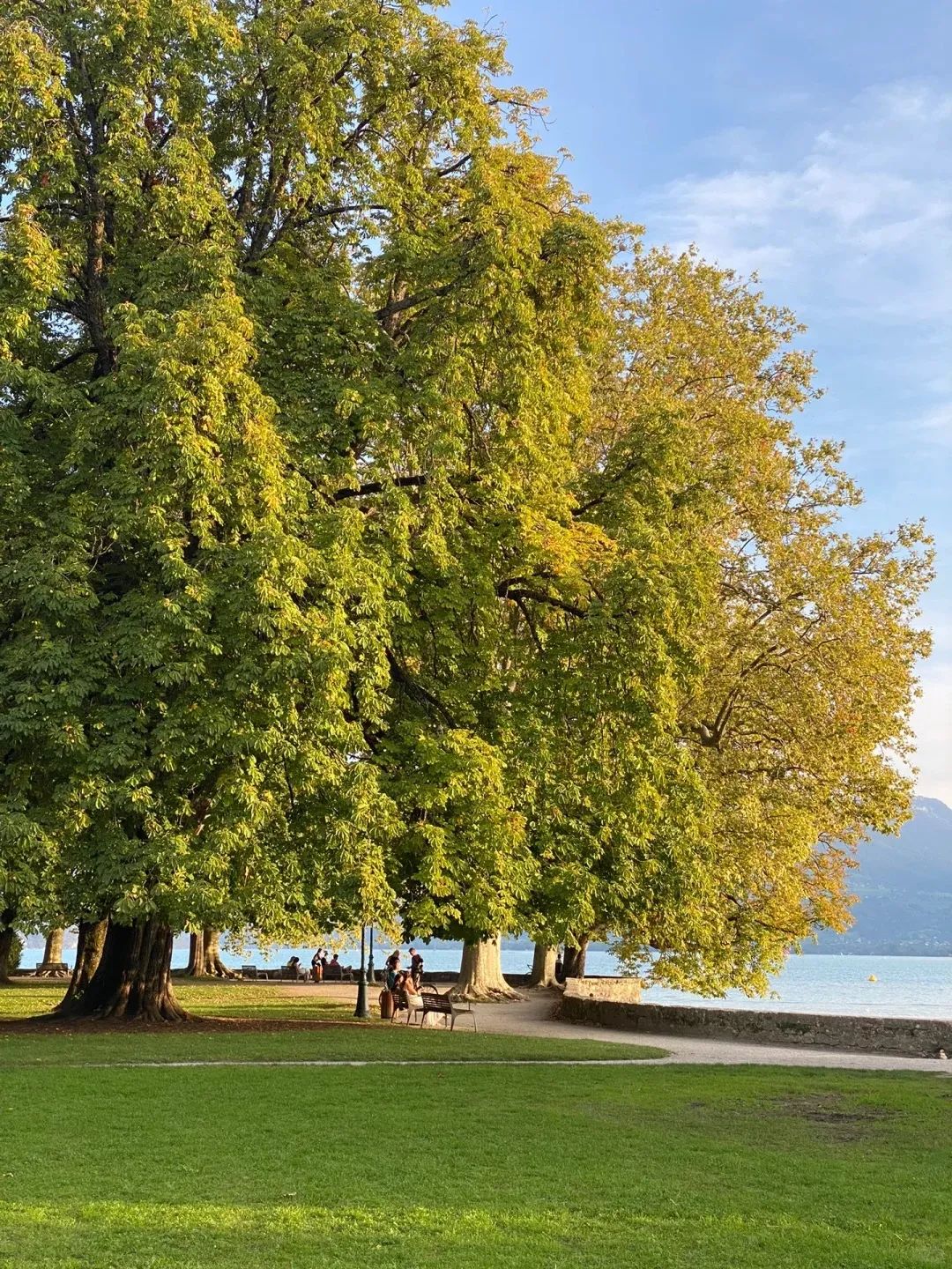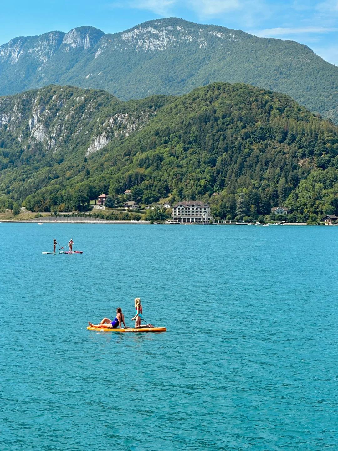 安纳西湖边还有欧式花园,许多人坐在草地上野餐,阳光照射在湖面上波光粼粼,一直有白天鹅缓缓游过。