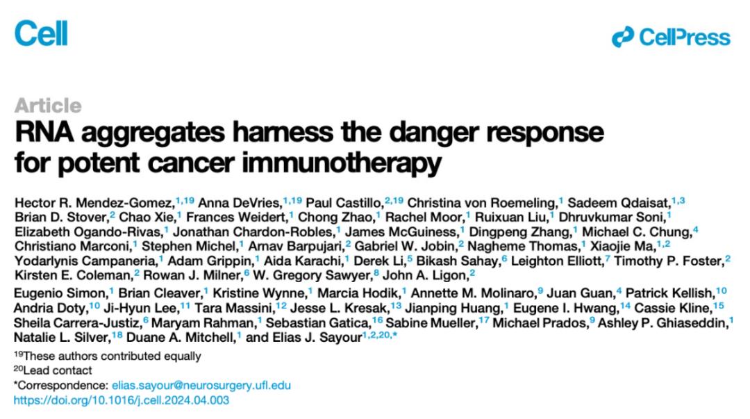 2024年5月1日,佛罗里达大学的研究人员在国际顶尖学术期刊 Cell 上发表了题为:RNA aggregates harness the danger response for potent cancer immunotherapy 的研究论文。