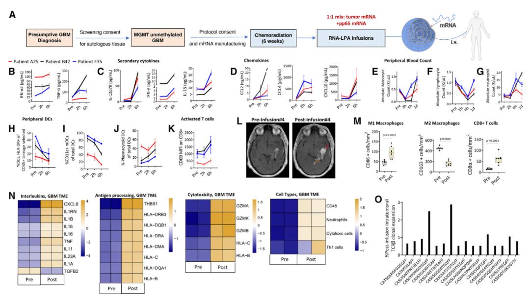 该研究还在4名成年患者中进行了首次人体试验,用于治疗最具攻击性和致命性的脑肿瘤——胶质母细胞瘤,该mRNA癌症疫苗在注射后迅速重新编程了患者的免疫系统,引发了细胞因子/趋化因子的释放、免疫激活/转运,并在胶质母细胞瘤患者中引发了特异性免疫反应。这些数据支持RNA-LPA作为一种同时重新编程TME并引发快速持久癌症免疫疗法的新技术。