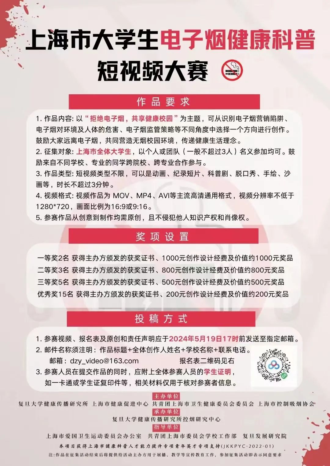 2024年5月31日是第37个“世界无烟日”,为提高上海市在校大学生群体对烟草危害的重视程度,科学引导拒绝烟草和电子烟的健康理念,助推无烟健康校园建设,复旦大学健康传播研究所、上海市健康促进中心、共青团上海市卫生健康委员会委员会和上海市控制吸烟协会联合举办上海市大学生电子烟健康科普短视频大赛,邀请你用镜头讲述电子烟背后的真相!