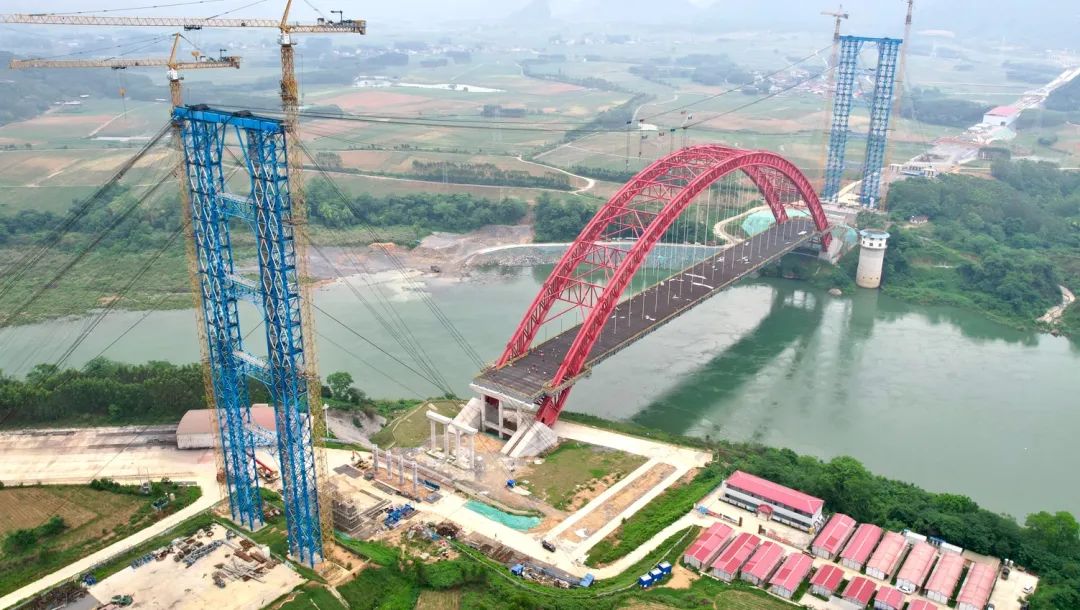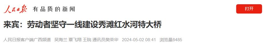 据介绍,来宾西过境线高速秀滩红水河特大桥位于广西来宾市兴宾区,全长514米,主桥长356米,桥面宽31米,设双向四车道。经过建设者们的攻坚克难,特大桥已于今年1月16日顺利合龙,截至4月底,来宾西过境线高速公路完成年度投资2.98亿元,开工累计完成投资18.09亿元。“五一”假期,300多名工程建设一线人员放弃休假,坚守在施工一线,铆足干劲,要在5月1日完成主桥全部钢筋安装,5月2日开始进行主桥桥面系钢混组合梁混凝土铺装首幅浇筑。