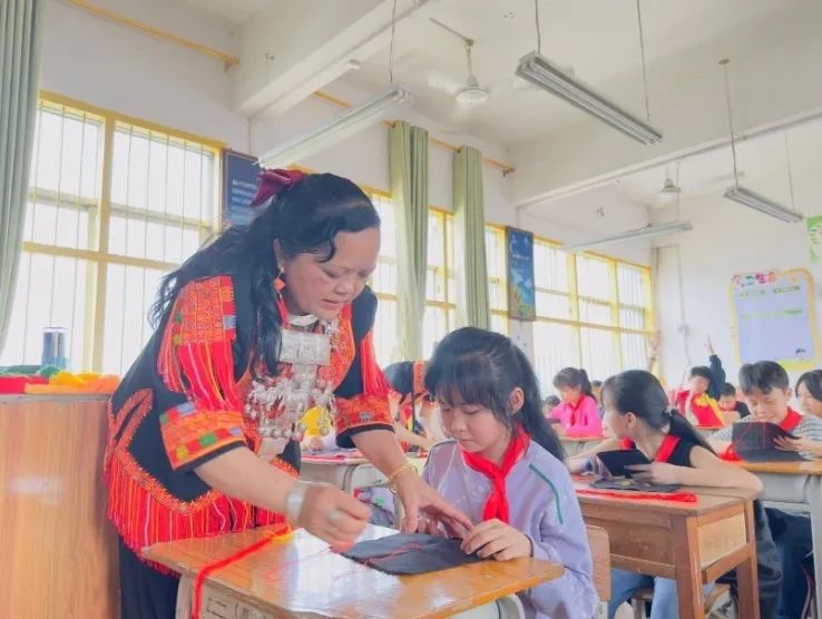 赵凤香和徒弟在课堂上教学生瑶族织绣。课堂上,赵凤香等人熟练地穿针引线,反绣、正面绣、全绣等织绣工艺手法让人目不暇接,学生们沉浸式体验瑶族织绣魅力,在穿针引线间感受织绣之美,体会古老非遗魅力。