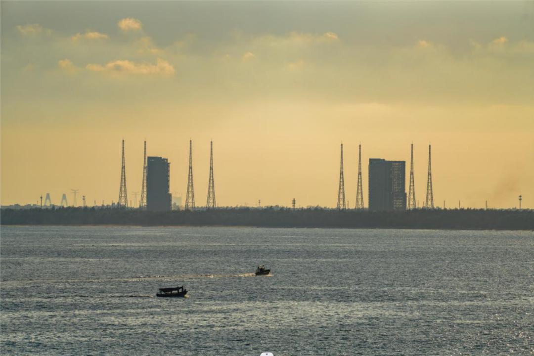 5月的文昌,阳光热辣。绵延的椰林深处,文昌航天发射场如一颗明珠嵌在翠绿之中。发射场位于海南省文昌市龙楼镇,东经110°北纬19°,是中国首个滨海发射场。