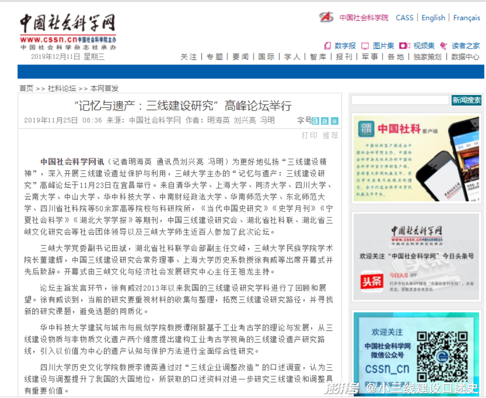 图4:2019年11月25日中国社会科学网刊发的新闻报道。