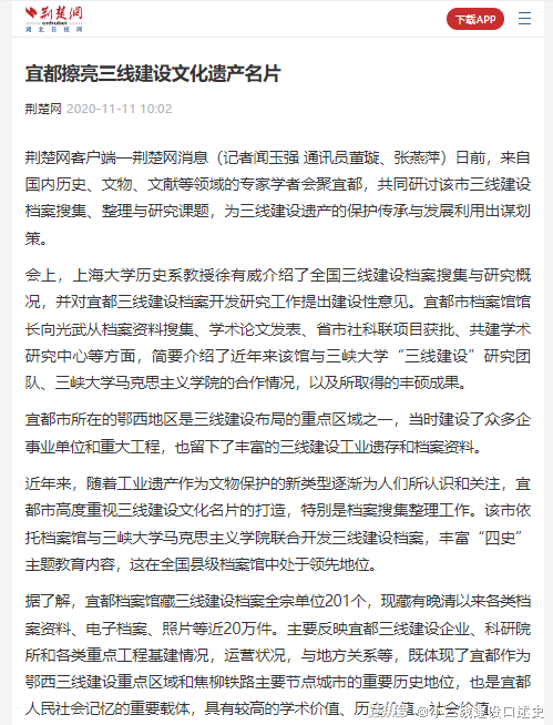 我领的三峡大学三线建设研究团队与宜都市档案馆积极合作,共同推动该馆所藏的“三线建设档案”于2023年3月上旬成功入选“第二批湖北省档案文献遗产”(图13),这是全国首份三线建设档案入选省级档案文献遗产名录,标志着国内三线建设档案学术研究与保护利用实现新突破。《三线建设史料选编》丛书第一辑《焦枝铁路宜都县民兵师报纸卷》书稿即为这批“三线建设档案”的重要组成部分。双方将联合全国从事三线建设资源保护和研究的档案部门、学校、研究机构、企业、社会团体机构以及出版部门,共同推动全国三线建设档案早日入选“国家档案文献遗产名录”。