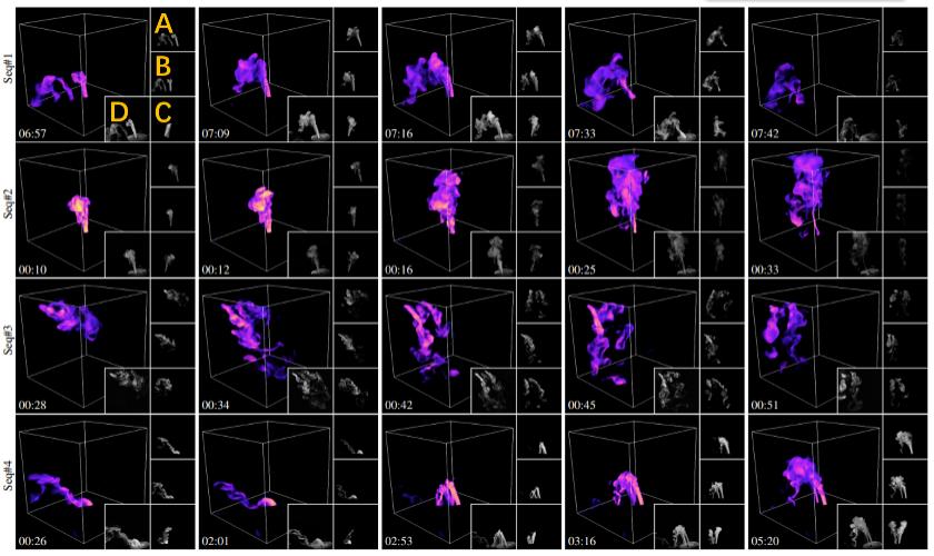 对于烟雾等动态三维物理现象的高效高质量采集重建是相关科学研究中的重要问题,在空气动力学设计验证,气象三维观测等领域有着广泛的应用前景。通过采集重建随时间变化的三维密场度序列,可以帮助科学家更好地理解与验证真实世界中的各类复杂物理现象。