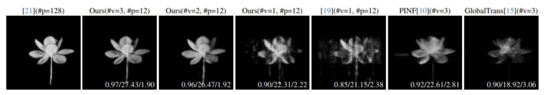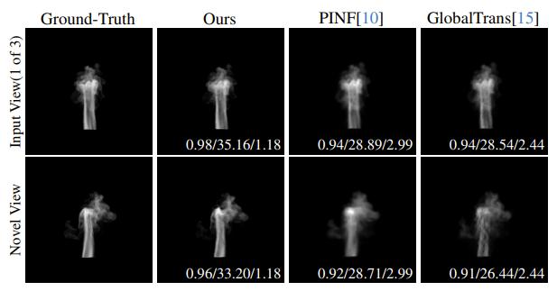 图 8:仿真烟雾序列上不同方法的比较。从左到右依次为真实值,本方法,PINF [3] 和 GlobalTrans [2] 重建结果。输入视图和新视图的渲染结果分别显示在第一行和第二行中。定量误差 SSIM/PSNR/RMSE (×0.01) 展示在相应图像的右下角。整个重建序列的误差平均值请参考论文补充材料。另外,整个序列的动态重建结果请参见论文视频。未来展望