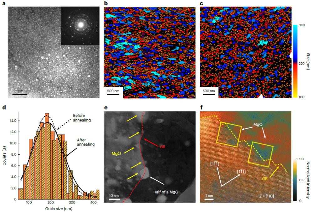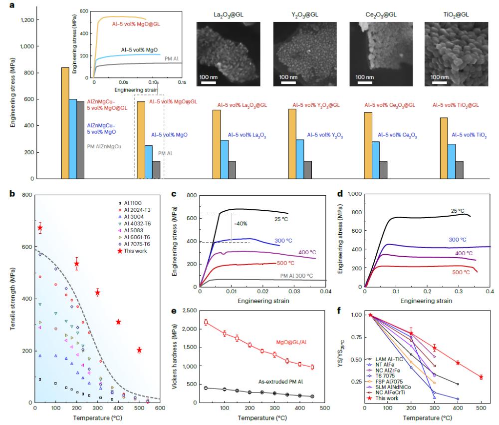 图为材料优异的室/高温力学性能。为此,何春年团队通过在铝合金中引入高含量、超细尺寸、均匀分散的纳米氧化物颗粒,成功提升了铝合金的耐高温性能。在研究中,该团队提出了全新的制备思路,解决了困扰已久的纳米颗粒的分散难题,将理论上最理想的材料转化为现实。最终,研制的新型铝合金在500℃的拉伸强度(200兆帕)相比传统铝合金提高了6倍以上,高温稳定性提高了几个数量级。
