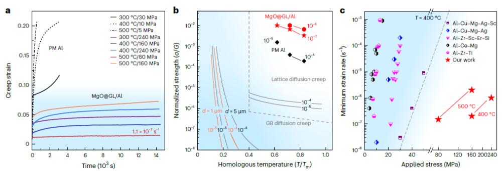 图为材料优异的蠕变性能。研究工作发表后,国际知名金属材料专家、法国格勒诺布尔国立理工学院Alexis Deschamps教授对这一工作的重要性和潜在影响做了详细的评论和深入解读,认为该工作“发展了新型超细纳米氧化物弥散强化合金设计新策略,使得所制备的铝合金在高达500℃时仍具有前所未有的拉伸强度和抗高温蠕变性能,为铝合金在高温环境中的应用开辟了崭新领域”。