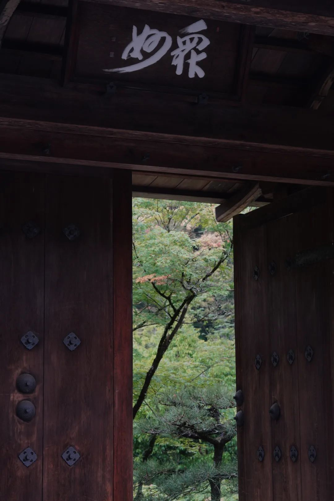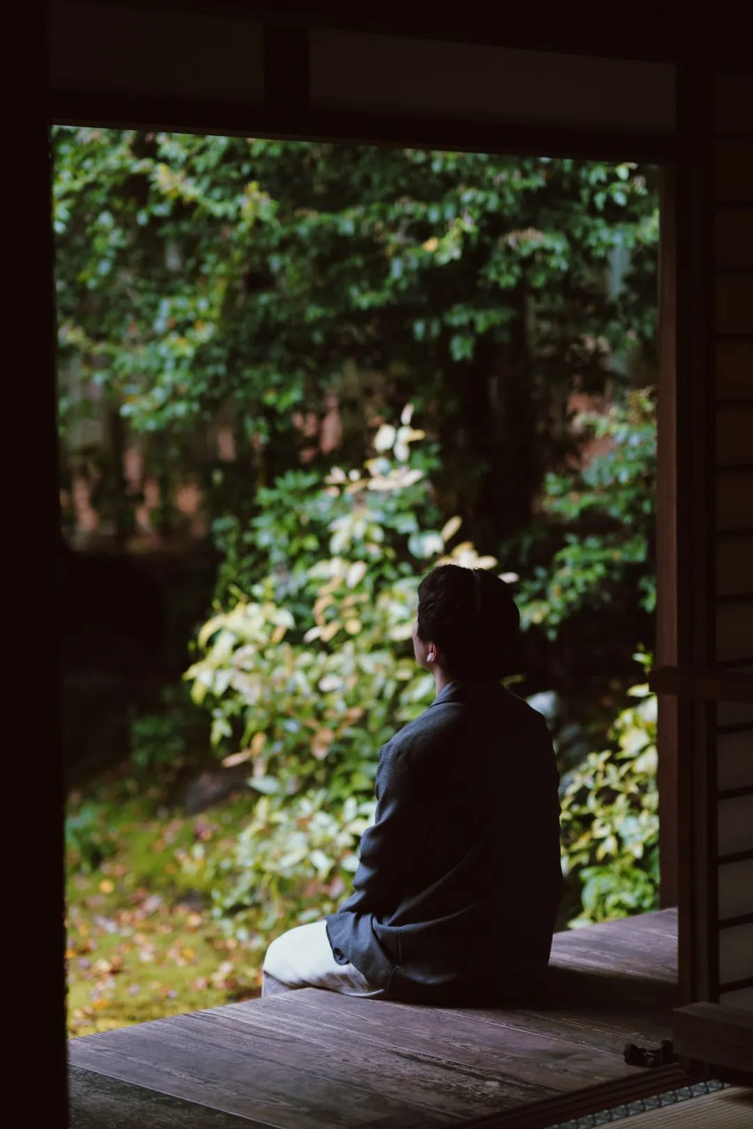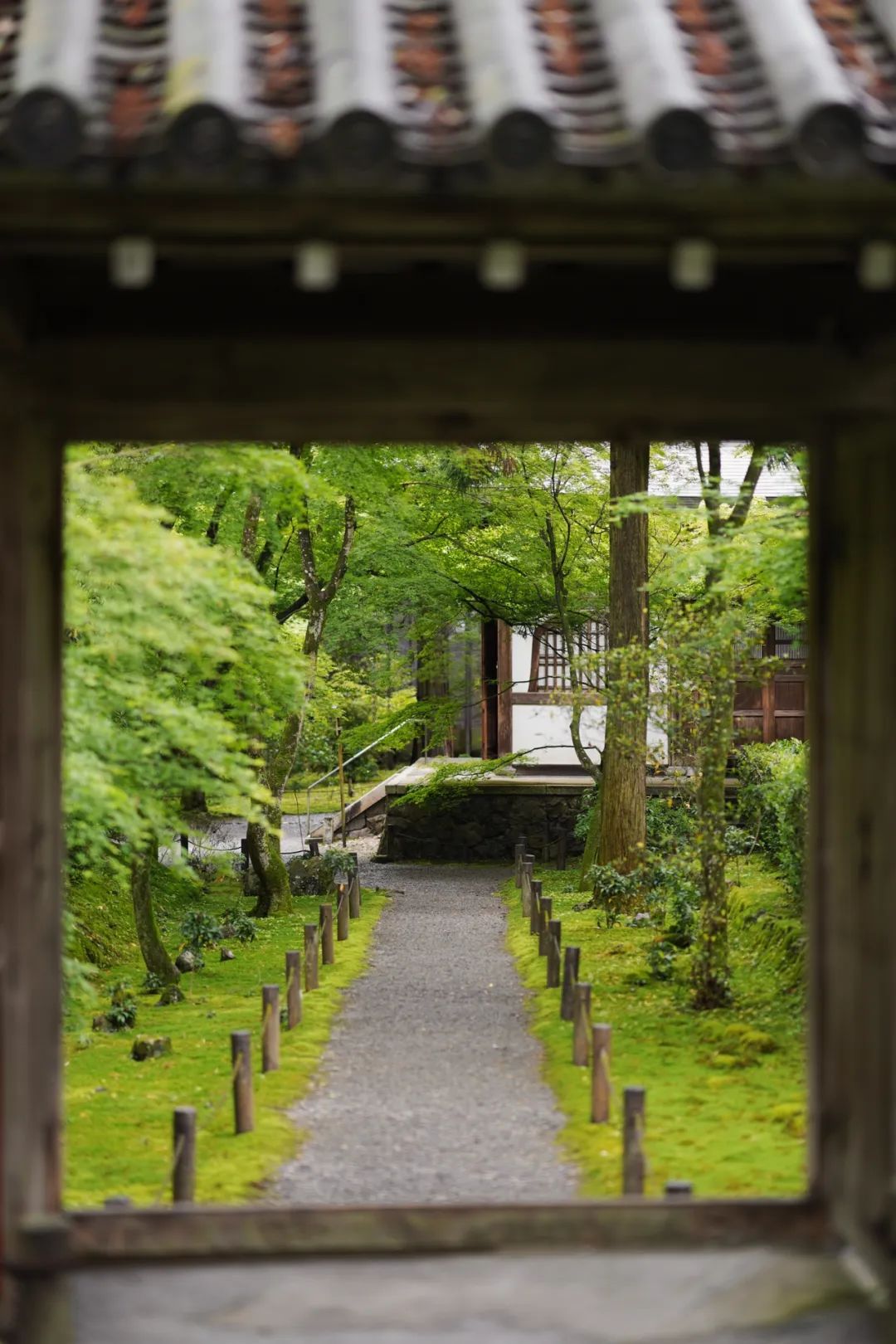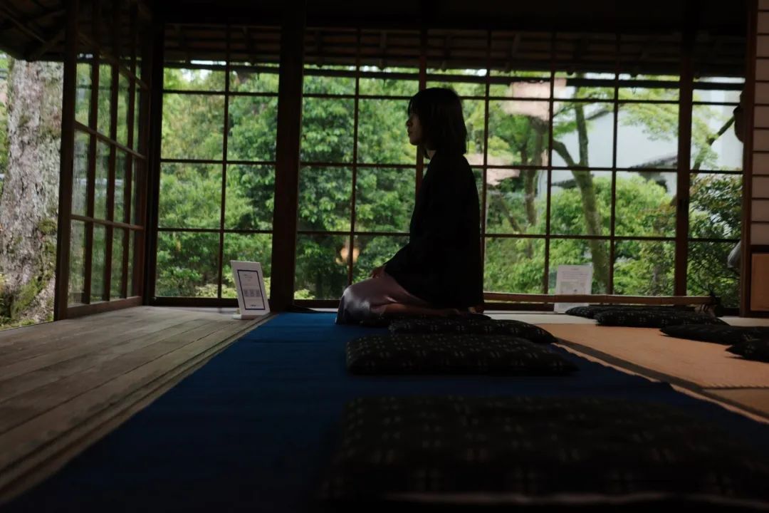 右侧一条小径,通往住持的居所,以及附带的禅宗庭园。与西芳寺的庭园相比,这里很小,但是,它也更私密。因为是雨天,天光不强,但在木制的建筑内,形成了一种阴翳之美。坐在这里,看着外面满目的绿色,好像与世隔绝了一般。非常非常静心。