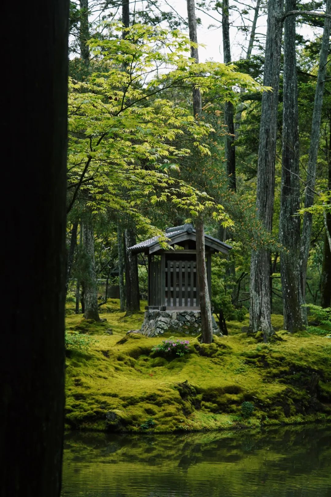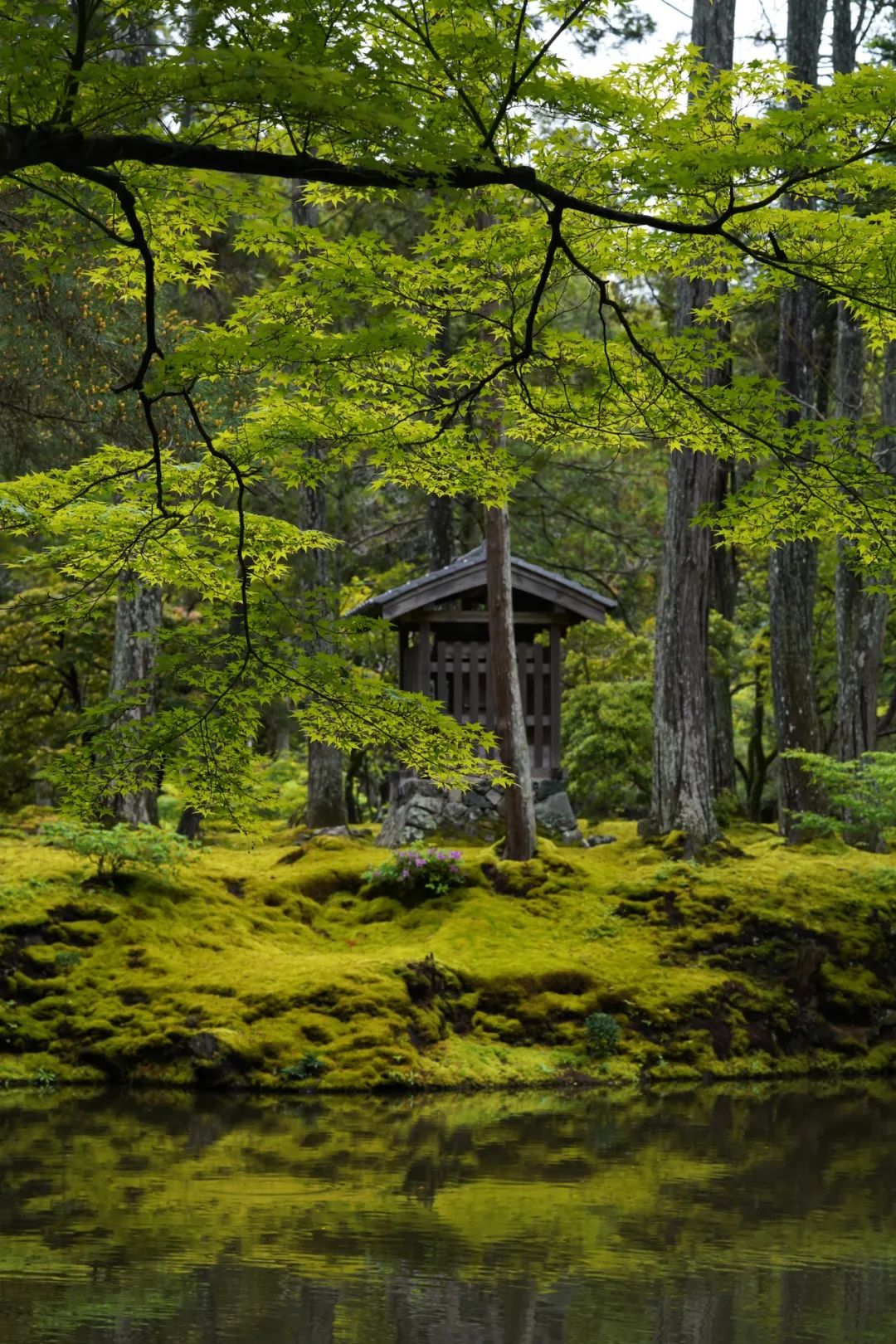 在湖中心的小岛,以及所有的树木之下,都覆盖着苔藓。这天下着小雨,虽然没有阳光,却也别有一番滋味。地藏院