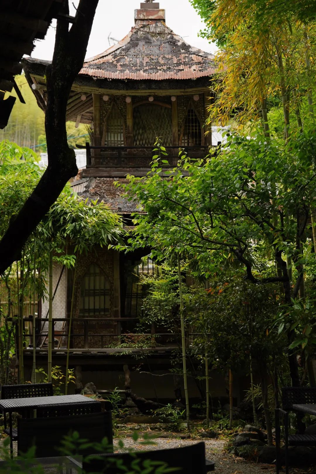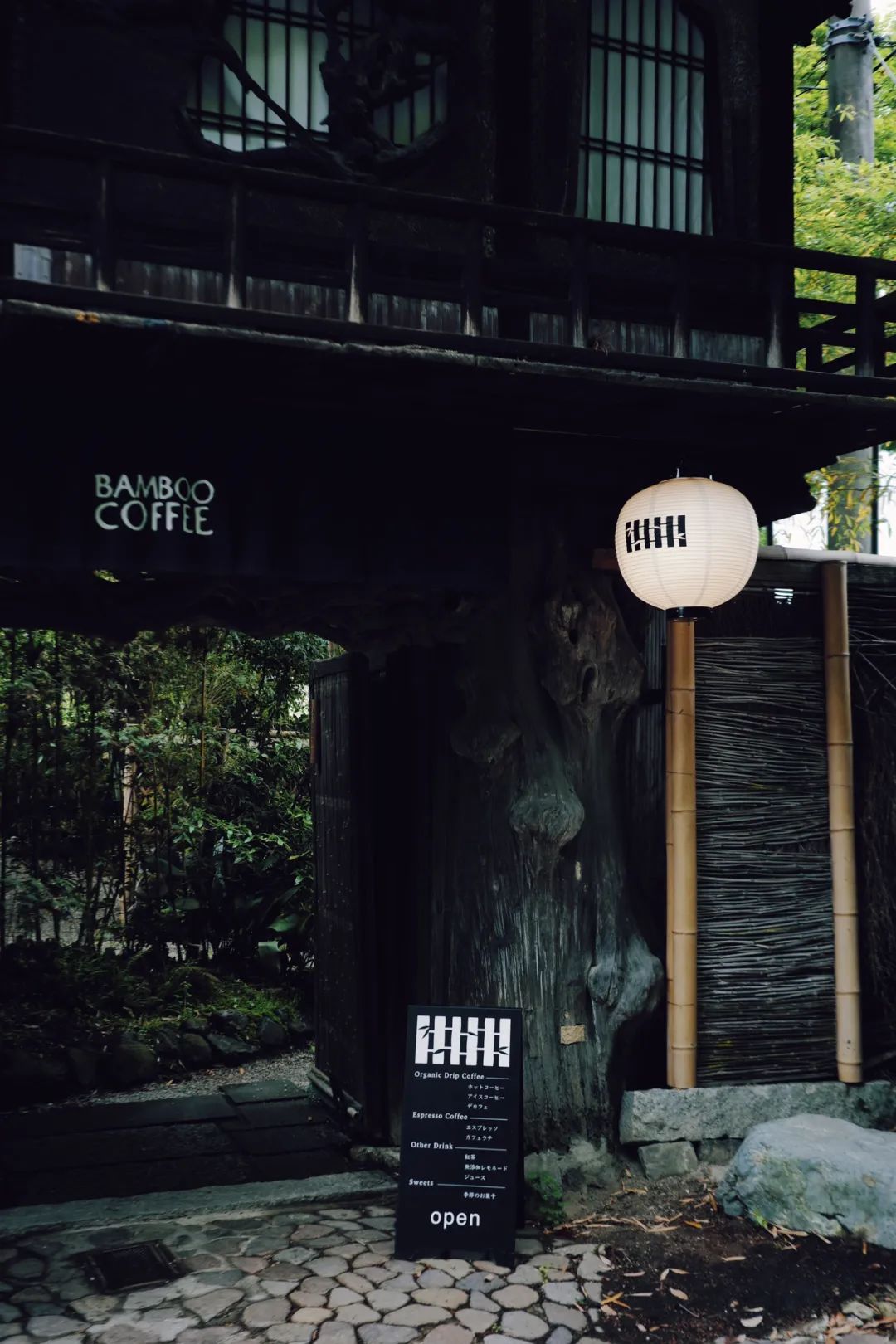 因为预约西芳寺的时间卡在11点,所以中饭是在711解决的。下午,在西芳寺不远处的bamboo 咖啡坐了一会。这家咖啡店的门脸就很古朴,走进去,还有一个小园子,里面有一座不高塔楼,不知道是做什么用的。