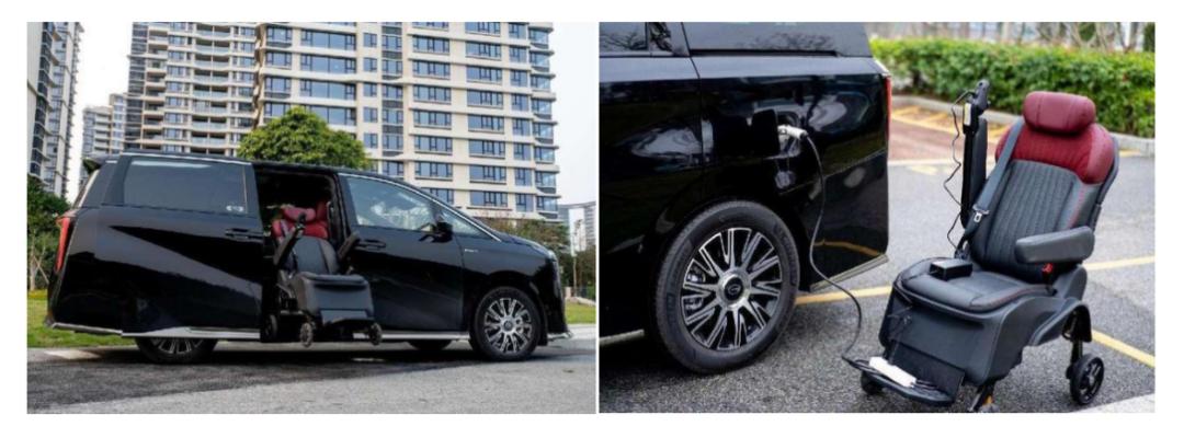 该车搭载了全球首创的可分离电动福祉座椅,落地后能够轻松与车体分离,化身为一张电动移动座椅,让行动不便的老人也能畅享出行自由。