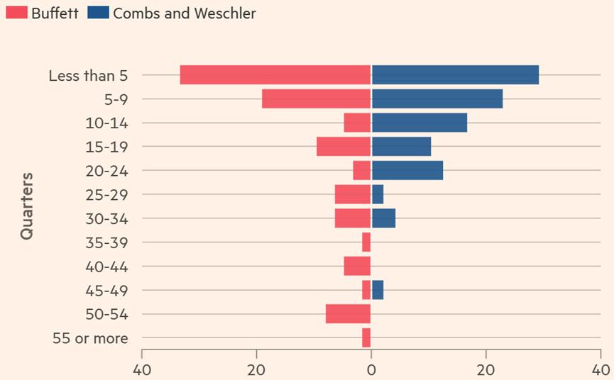 自2010年以来,巴菲特已经出售了63个头寸的全部持股,平均持有时间为四年零三个月。康姆斯和韦施勒则退出了48只股票,持有时间仅为两年零十个月。