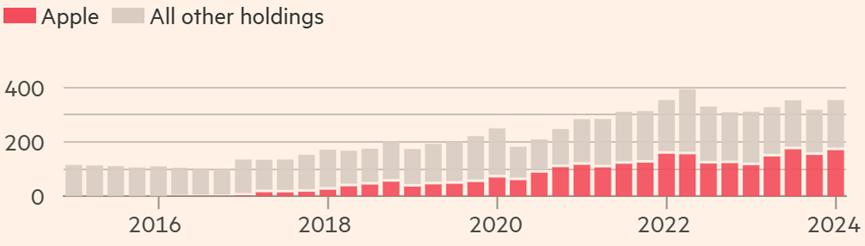 在接下来的几年里,巴菲特也加入了这个交易,他被持续不断的iPhone消费者需求所说服。伯克希尔共花费了约400亿美元购买苹果公司的股票。到去年年底,这些股票价值大约1750亿美元,超过了伯克希尔总估值的五分之一,即使在这些年里,公司已经卖出了价值160亿美元以上的股票。
