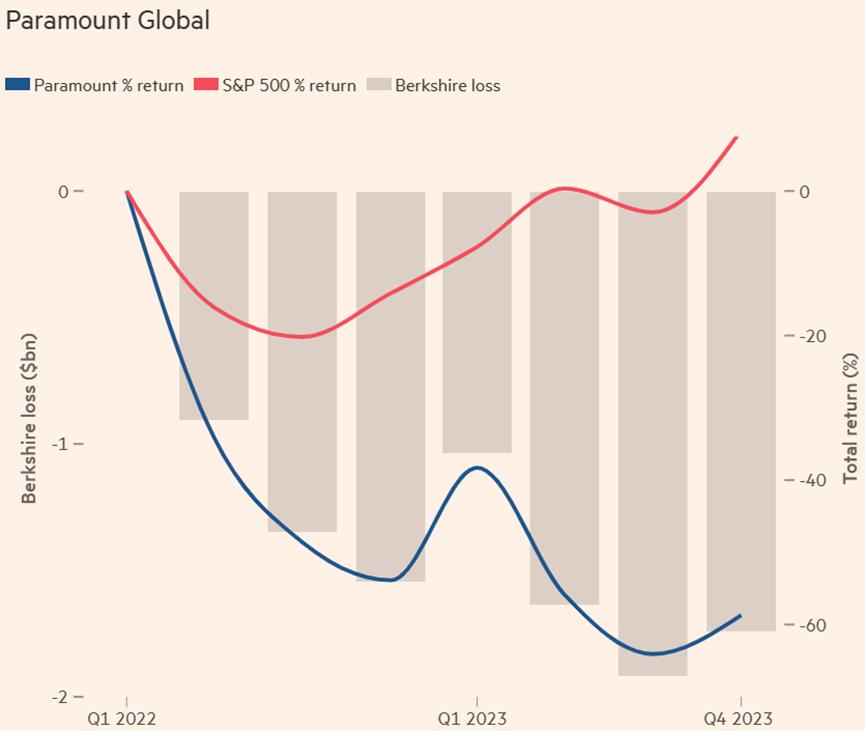 他们还可能是导致对帕拉蒙特全球(Paramount Global)灾难性投资的幕后推手,该公司拥有MTV和CBS。巴菲特没有具体说明是哪位经理在2022年进行了260亿美元的交易,当在去年的年会上被问及这笔交易时,他没有承认这个糟糕的投资,这与他经常的作风不同。