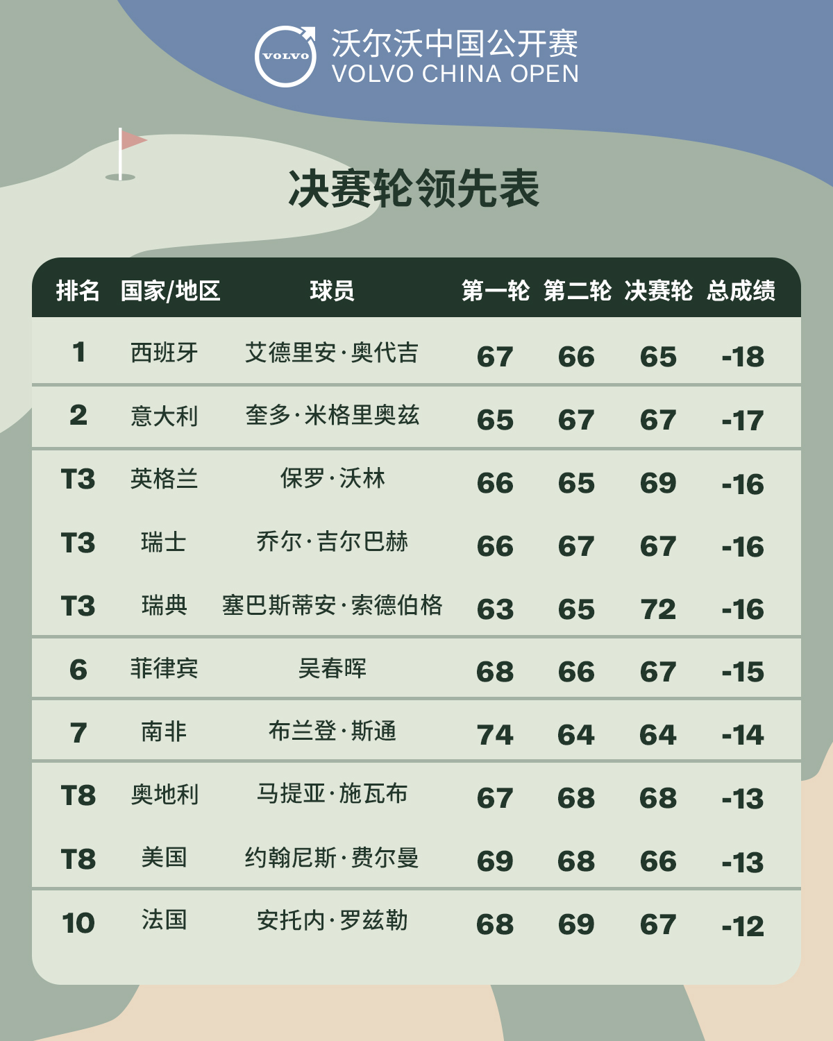 刚刚过去的这个周末,第29届沃尔沃中国公开赛在深圳隐秀高尔夫俱乐部落下大幕,西班牙选手艾德里安·奥代吉决赛轮从落后5杆一路追赶,最终打出65杆,逆转获胜。