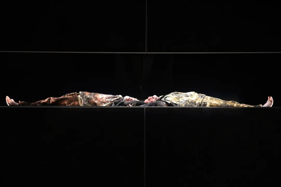 演出在防空警报的背景声中拉开帷幕,两块矩形缓缓上升,形成一个狭长的表演区,在这个宛如鱼缸的逼仄空间内,主角戈戈和狄狄冈躺在暗黄色的灯光下,嬉笑聊天。背景音乐的哀婉与他们的笑声形成了鲜明对比,笑,没有营造出欢乐的氛围,反而让一股悲伤瞬时充满了剧场。音乐全程伴随着该版演出,时而是纯音乐的乐器演奏,时而是教堂唱诗班的歌声,这些音乐以其具有的悠扬凄婉,为整个演出增添了沉重的情绪色彩。在长达十五分钟的时间里,两位演员头靠头,复述着原作的台词,将漫长且单调的等待具象化。随后,演区上方的两个相并的矩形逐渐分开,为演员提供了站立的空间。波卓从后缓步走出,而幸运儿则缓缓从下方升起。他在狭窄的矩形空间里不断来回踱步,小声自言自语,机械的行为营造出了一种焦躁的紧张气氛。特佐普罗斯戏剧美学中强调的“癫狂”元素,在此刻开始萌发。