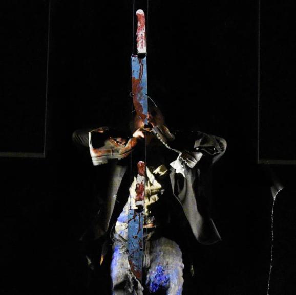 在第二幕开启前,防空警报和轰炸声的设计不仅增强了剧场的沉浸感,还引入了战争的背景,一排带着血的尖刀缓缓在十字架演区前落下,使得演出的氛围变得更加压抑和紧张。熟悉《等待戈多》的观众都清楚,第二幕基本是对第一幕的重复,如同演出一开始那样,戈戈和狄狄依旧躺在那个鱼缸状的表演空间内。不同的是,这一次他们不再是头对头,而是脚对着脚,时间的循环感和角色之间的孤独与绝望得以展现。当波卓和幸运儿再次登场时,他们与戈戈和狄狄的对立站位形成了一个十字架形状。在笔者看来,十字架在这里不仅是宗教的象征,更深层地指向了人生的苦难与痛苦的普遍性,昭示了每个人在面对命运时的无助与挑战。