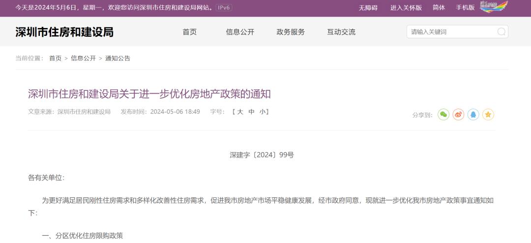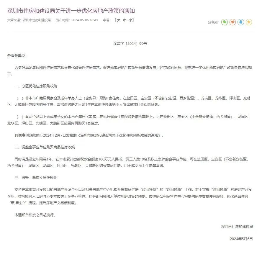 5月6日,深圳市住房和建设局发布《关于进一步优化房地产政策的通知》(以下简称《通知》),从分区优化住房限购政策、调整企事业单位购买商品住房政策、提升二手房交易便利化等方面进一步优化房地产政策。