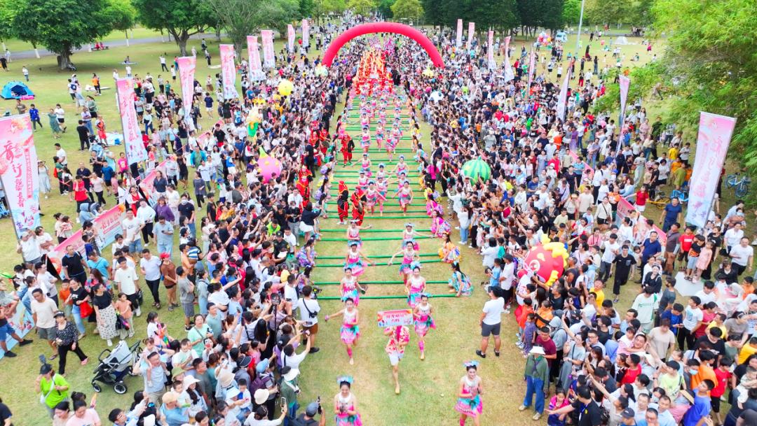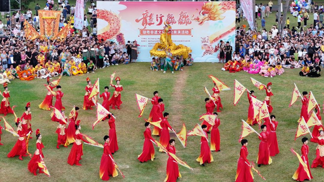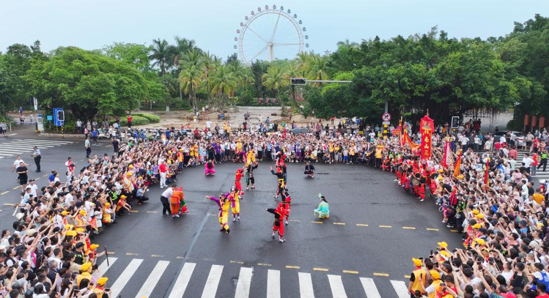 兴潮天后宫英歌舞巡游活动5月1日下午,琼粤非遗文化交流展演活动在万绿园举行,英歌战舞、舞狮表演,现代舞蹈、黎族竹竿舞、冼夫人令旗表演轮番上演。观众把现场围得里三层外三层,水泄不通。