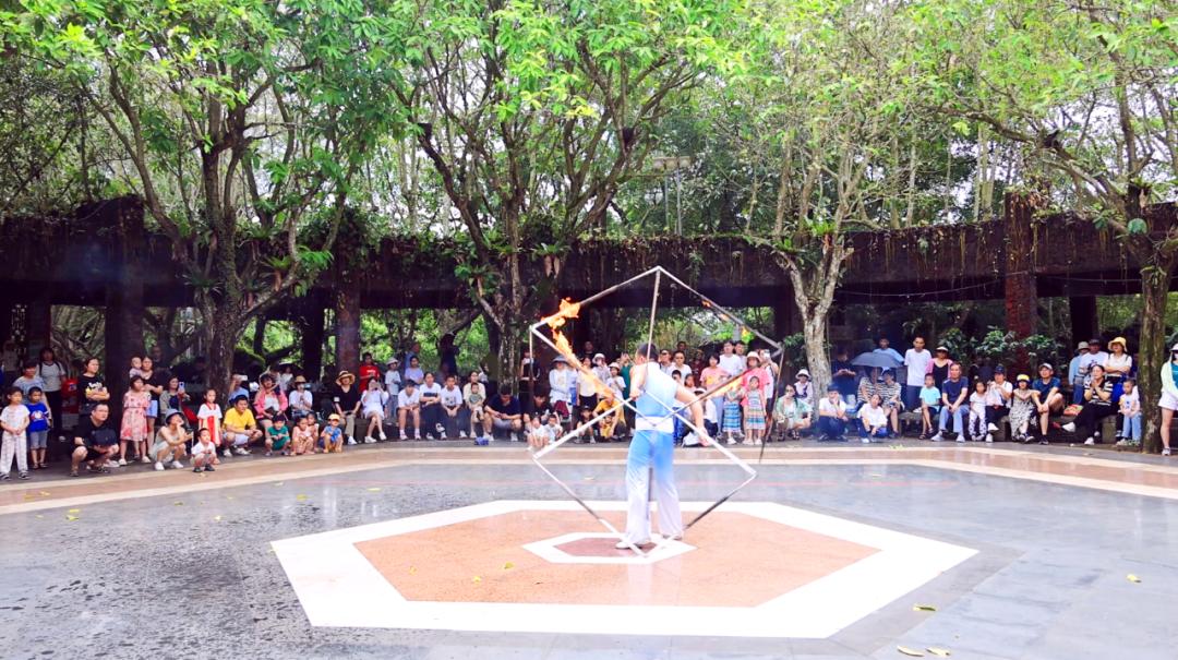 海口火山口公园内游人如织,火山民俗文化表演现场好评不断、掌声连连,将欢乐喜庆的节日氛围推向高潮。