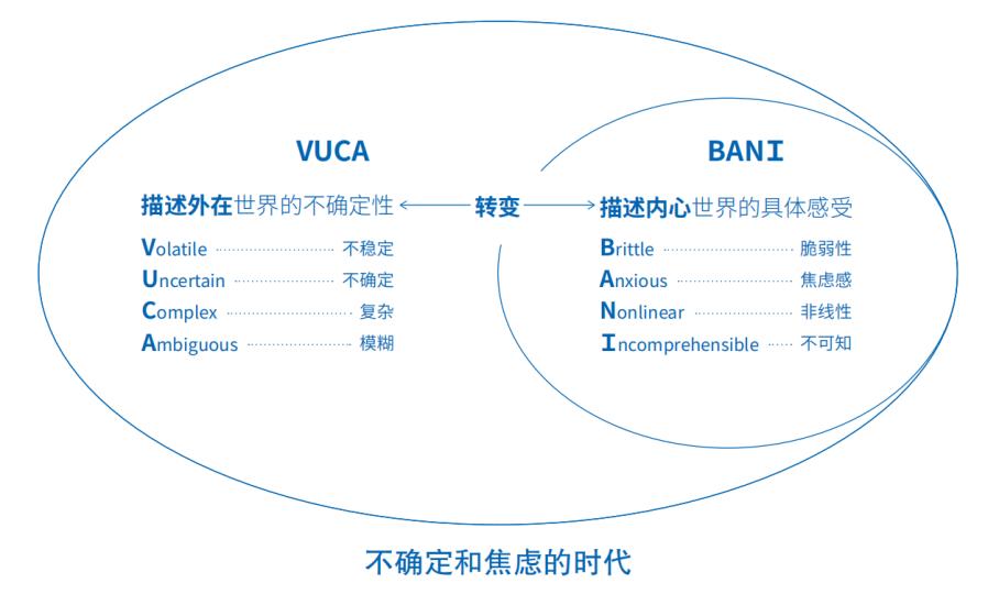 有学者在2016年提出了一个新名词来概括时代的特征,叫BANI,即脆弱性(brittle)、焦虑感(anxious)、非线性(nonlinear)和不可知(incomprehensible)。
