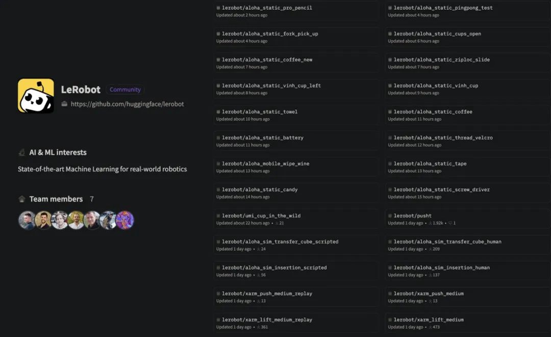 LeRobot发展的基础是创建有史以来最大的众包机器人数据集。通过与大学、初创公司、大型科技公司和个人爱好者合作,Hugging Face 正在促进庞大机器人数据存储库的建立——这其中包含数以TB计的机载视频记录,这些视频记录正在使用轻量级的 LeRobot Dataset 进行格式化,以便通过Hugging Face快速上传和下载。