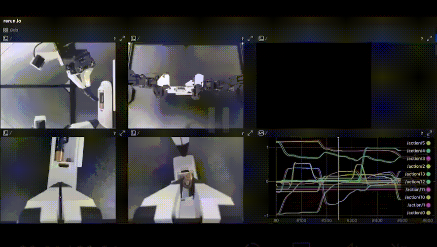 比如,在这个数据可视化的例子中,它展示了LeRobot是如何在Return(一个SDK和查看器,用于可视化与多模态数据流交互)上运行的,数据集来自Aloha项目(用于异构架构运行时自适应和安全深度学习的软件框架,主要目标是促进深度学习算法在异构低能耗计算平台上的实现,为最佳算法选择、资源分配和部署提供自动化。