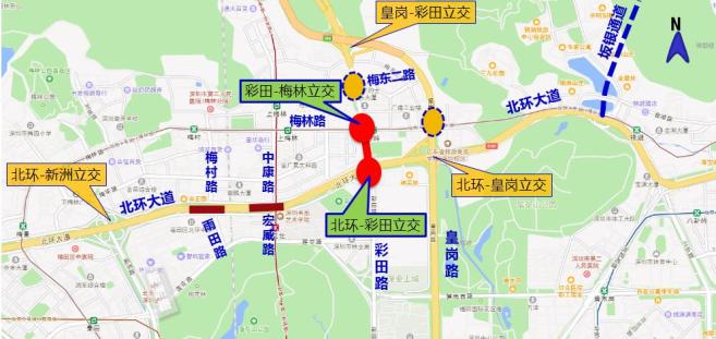 为缓解交通需求压力,彩梅立交改造工程对彩田路、梅林路、北环大道的相交节点进行改造。