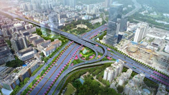 ▲鸟瞰效果图建成后将进一步完善彩田-梅林-北环立交的交通转向功能、对加强梅林片区对外交通衔接、实现中部轴线的快速公交主走廊具有重要意义。