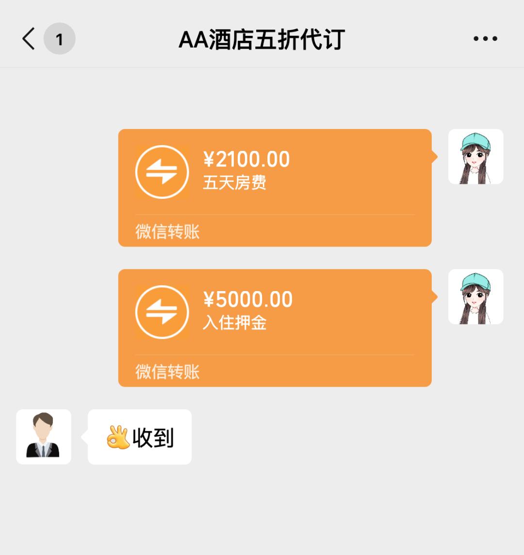 李女士心动不已,随即将自己的个人信息及预订的具体时间发送给对方,并向对方微信转账五天房费共计2100元人民币。