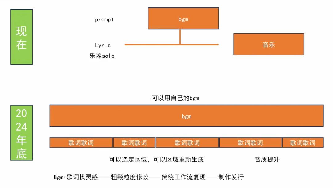 新的音频模型可以通过一个简单的Prompt生成出完整的BGM,而TTS模型可以生成完整的歌曲。接下来,我们可以预见,人们将能够自己制作个性化的BGM,并在其上填写歌词。每一句歌词都可以重新编辑,例如,如果觉得第二句不够理想,就可以重新编写。与此同时,音量调整也将变得更加灵活。我们相信,在今年年底,不止一家公司将推出这样的产品。到那时,音乐制作过程将变得更加普及化。音乐人们可能会首先选择一个自己喜欢的BGM,然后利用语言模型为歌词寻找灵感,并逐句进行修改和尝试。最终,他们可以按照传统的录音和音乐制作工作流程完成作品,并进行发布。