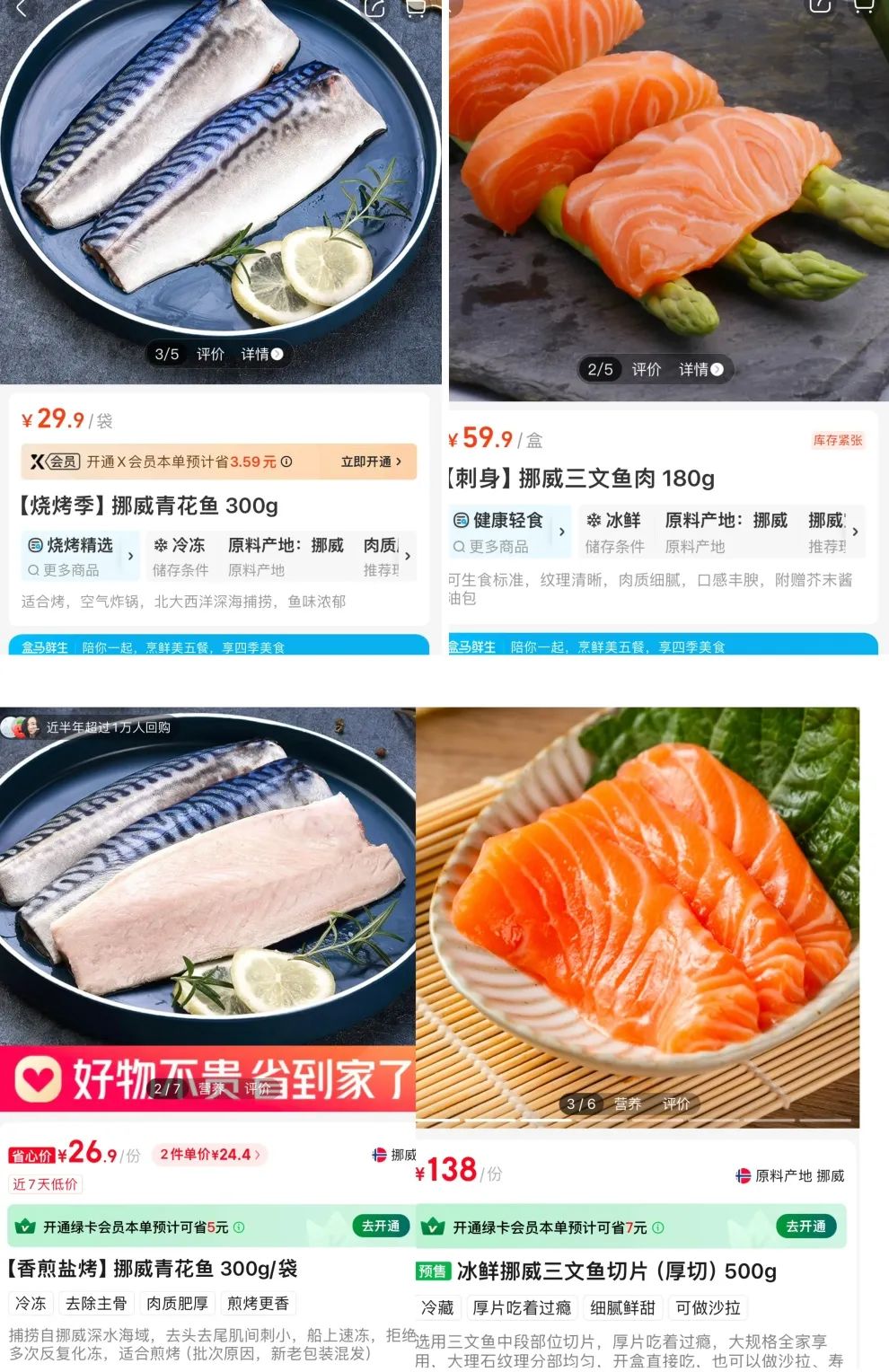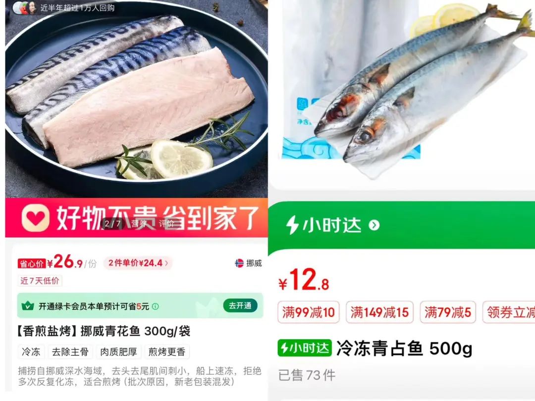 随手截了几个买菜 APP 的价格,可以看出挪威青花鱼比进口三文鱼至少便宜一半还多。