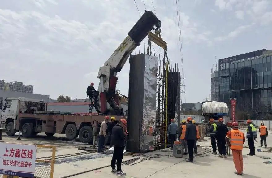 21号线一期金桥站位于上海市浦东新区金港路与金沪路交叉口西北侧,沿金港路西侧呈南北向布置,车站为地下二层岛式车站,基坑深度为18.35米。本次实施的金桥站北端头井11幅地墙,位于架空高压线投影面下方,有效施工净距仅为9.5米,而实际地下连续墙钢筋笼长达40米,施工难度大大增加。为保障施工的顺利开展,申通建设集团第四分公司组织各参建单位精心策划,针对高压线下地墙施工使用极限净空下钢筋笼分节吊装方案。采用低净空成槽施工,将钢筋笼拆分成9节,利用120吨折臂吊车在超低净空下进行钢筋笼吊装,顺利完成了本次超低净空地墙施工任务,为后续主体结构回筑奠定基础。