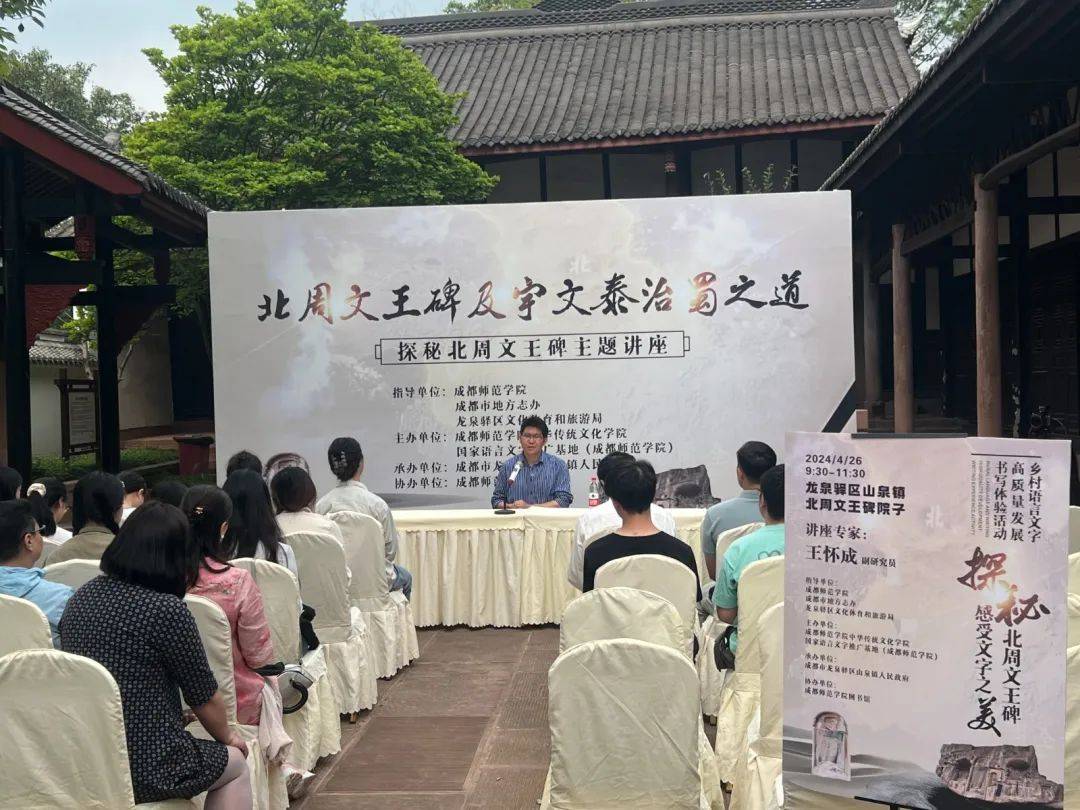 2024年4月26日上午,在成都市地方志办指导下,中华传统文化学院、孔子学堂联合主办,成都市龙泉驿区山泉镇人民政府承办、成都师范学院图书馆协办的“薪火•行知”系列实践活动课程之“北周文王碑及宇文泰治蜀之道”在北周文王碑文化陈列馆(筹)举行。活动邀请四川省历史学会副会长、四川省社科院历史研究院副研究员王怀成主讲。活动由文学与新闻学院副院长吴琪主持,《北周文王碑文史资料研究》《北周文王碑口述史资料研究》《北周文王碑文化陈列馆创新性实验建设项目》项目组成员孙玮、廖华西、伯咏归、张铭、姜海阳受邀参加,2020级新文科实验班全体学生在现场聆听讲座。