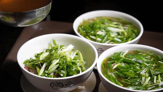 神奇小葱的神奇之处就在于它让本来不吃葱的人也能欣然接受,新鲜的小葱经过淘洗、沥干、冷藏等环节,厨师在备餐时撒上满满一捧在碗里,出餐时浇上一勺肉汤,小葱的鲜香一瞬间被激活,肉汤冲洗掉了最后的辛辣,并将自身的果蔬甜香附加其上,颇有画龙点睛的意味。05:灵魂配料