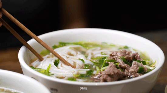 江湖上曾有一道名菜——18秒牛肉:爆炒牛肉从下锅到盛出只需要十几秒。猛火让牛肉中的水分迅速蒸发并将锅气和配料的香味锁在牛肉中,临出餐的一勺滚沸的肉汤进一步将牛肉汆熟,给这一碗粉注入灵魂,每一碗都会有超过100克的新鲜牛吊龙,肉质紧实、肉香四溢。03:粉