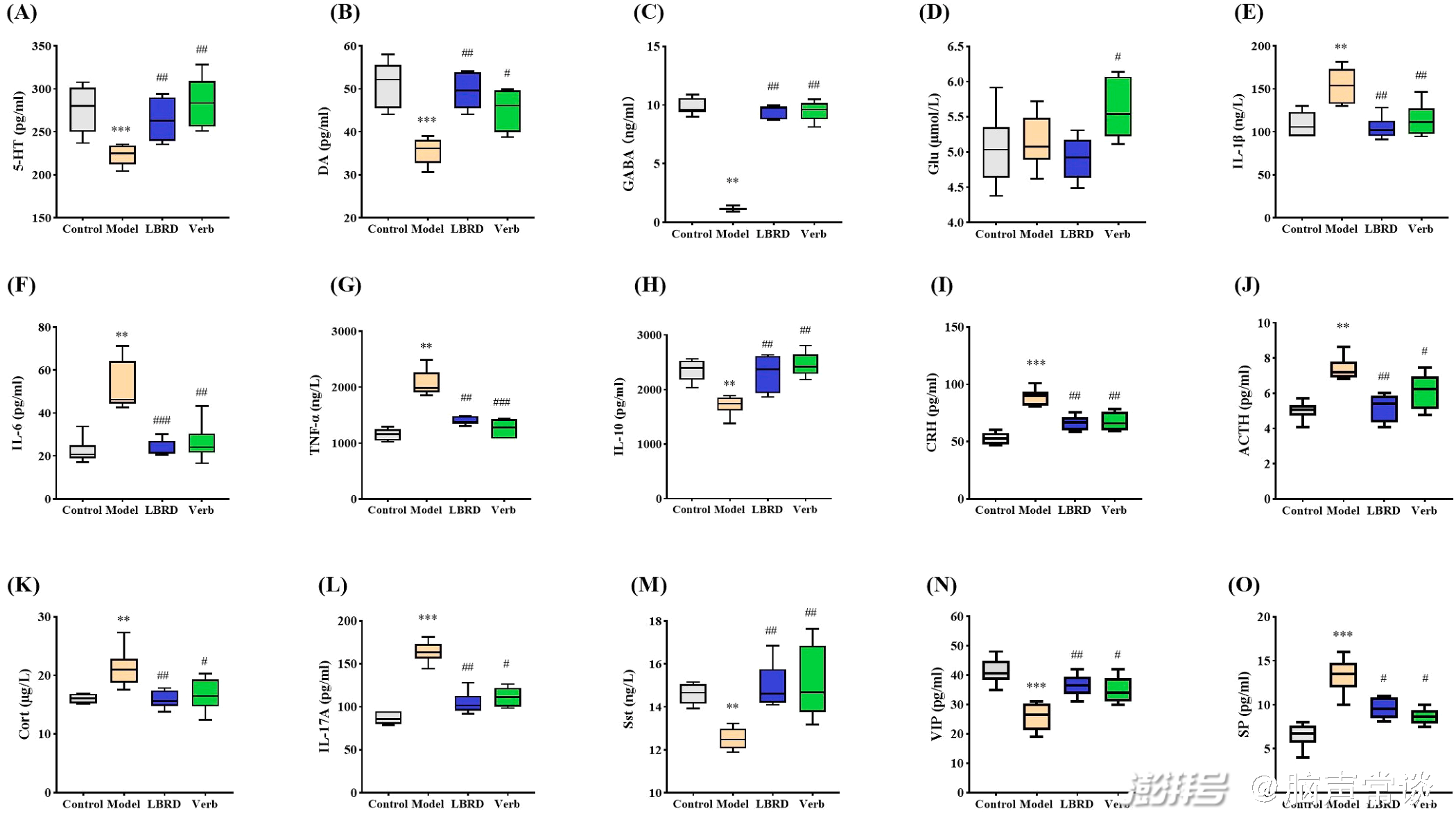 抑郁症常伴有神经递质、炎症、循环应激激素水平的异常变化。与治疗控制条件相比,CUMS治疗显著降低了5-羟色胺(5-HT)、多巴胺(DA)、γ-氨基丁酸(GABA)、白细胞介素(IL)-10和增强IL-1β、IL-6、IL- 17A、TNF-α、促肾上腺皮质激素释放激素(CRH)、促肾上腺皮质激素(ACTH)、血清激素。与CUMS诱导的抑郁样治疗组相比,连续21天口服LBRD或Verb可有效预防抑郁样改变。此外,CUMS诱导模型与对照组的兴奋性神经递质谷氨酸(Glu)含量无显著性差异。然而,用Verb处理的CUMS小鼠的Glu水平显著降低。经LBRD或Verb处理的CUMS小鼠结肠黏膜中生长抑素(Sst)、血管活性肠肽(VIP)水平显著升高,但SP水平降低。综上所述,这些数据表明LBRD或Verb可以通过产生神经递质、激素、炎症细胞因子和脑肠肽来调节脑肠轴来缓解情绪症状,从而缓解抑郁和焦虑。