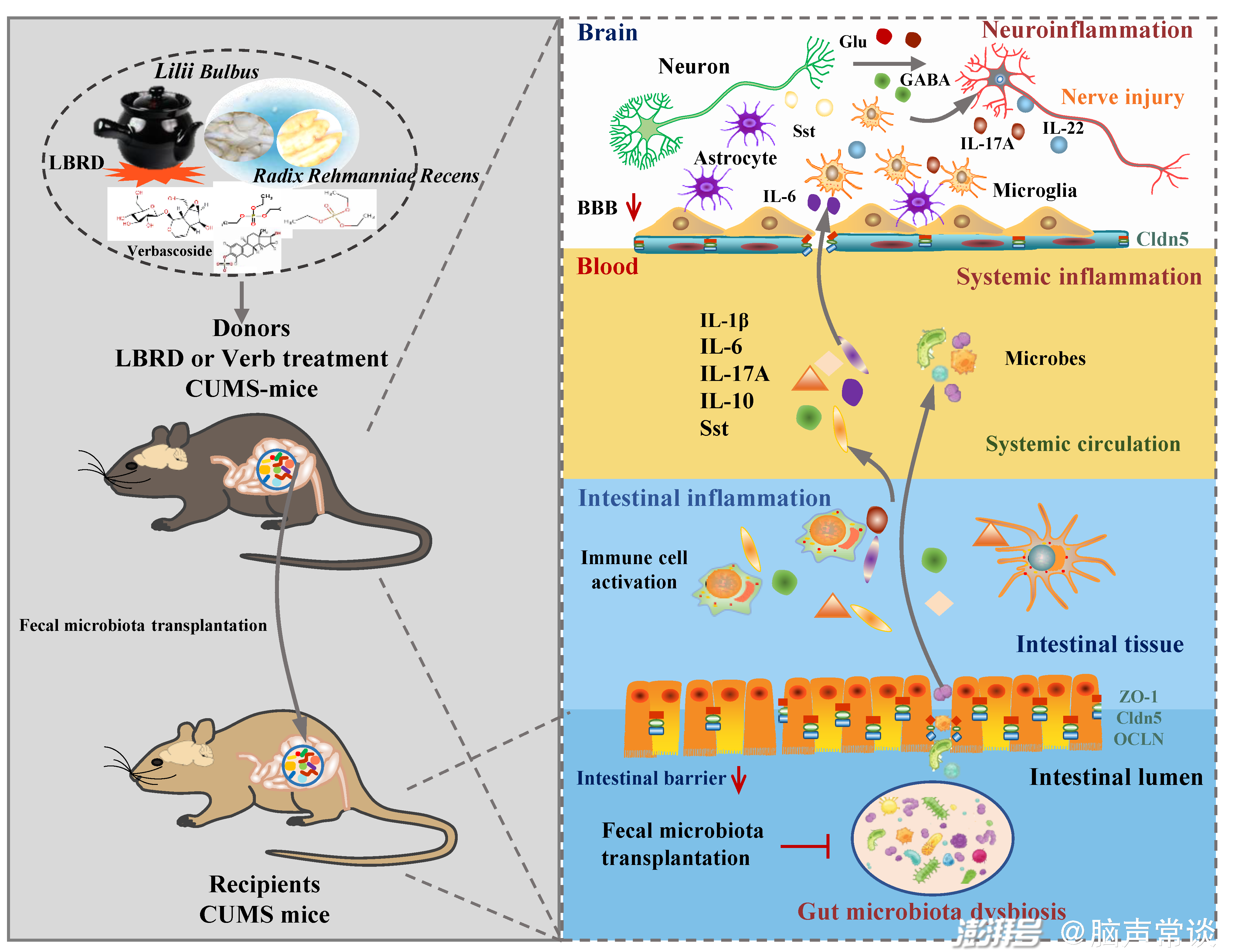 肠道微生物群在抑郁症的发病机制中起着至关重要的作用,通过肠道微生物群-脑轴(GMBA)维持宿主的稳态作为治疗靶点。百合地黄汤(LBRD)及其主要活性成分毛蕊花糖苷(Verb)可改善抑郁症患者的脑和胃肠功能。然而,在使用LBRD或Verb治疗抑郁症中,肠道和大脑通过GMBA双向通信的机制仍不清楚。
